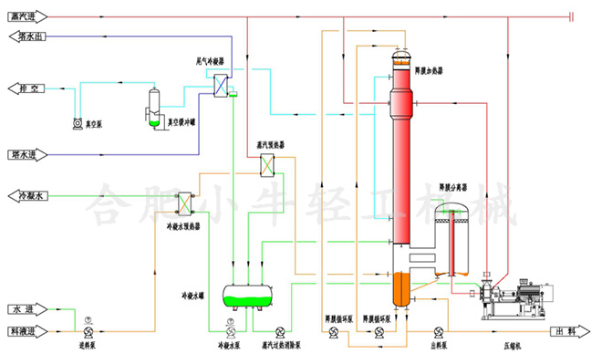 降膜蒸發器的料液是從蒸發器的頂部加入,在重力作用下沿管壁成膜狀下降,并在通過加熱管的過程中被蒸發增濃,在其底部得到濃縮液。MVR降膜蒸發器將加熱器的產生的二次蒸汽通過壓縮機的絕熱壓縮,能量進行壓縮提升,使其壓力、溫度提高后,再作為加熱蒸汽送入蒸發器的加熱室,冷凝放熱,使其對這壓縮過后的二次蒸汽加以利用,將其二次蒸汽內部潛熱進行回收。因二次蒸汽的潛熱得到了回收利用,所以該設備具有節省能耗的顯著特點。